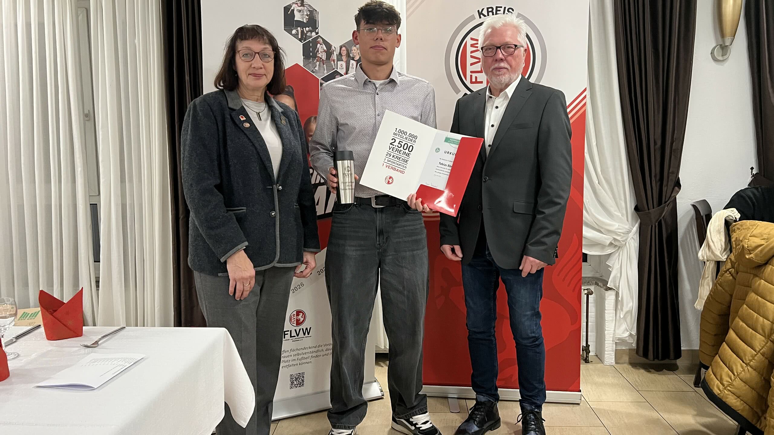 Ein besonderer Glückwunsch geht an Tobias Börchers, der im Rahmen von der Aktion „Junges Ehrenamt“ die Bildungsreise des DFB nach Barcelona gewonnen hat. Ebenso gratulieren wir Peter Keißelt, unserem Kreissieger beim DFB-Ehrenamtspreis, der an einem Dankeschön-Wochenende teilnehmen darf. Die beiden Sieger wurden im Vorfeld durch eine Abstimmung unter den teilnehmenden Vereinen ermittelt.